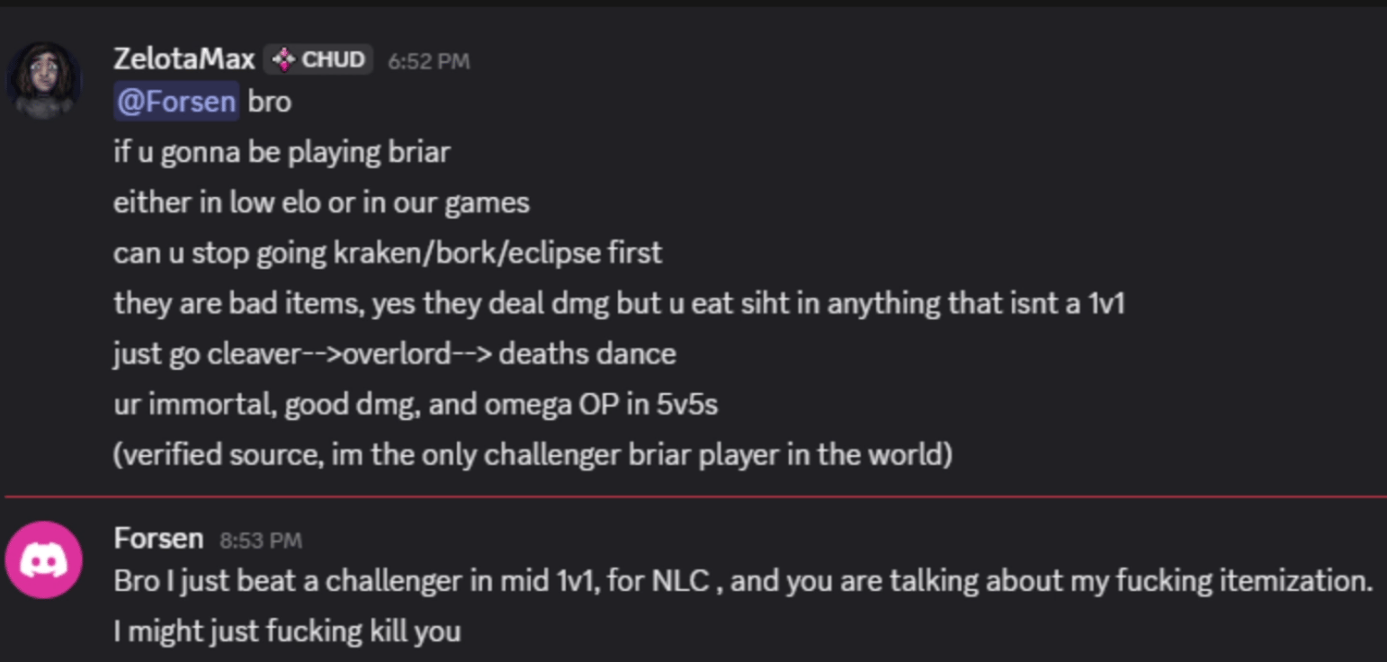 Bro I just beat a challenger in mid 1v1, for NLC , and you are talking about my fucking itemization.