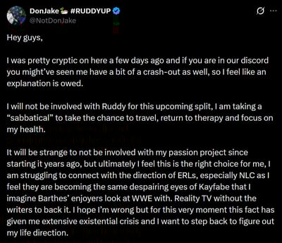 - X, NotDonJake, "[...] if you are in our discord you mightโve seen me have a bit of a crash-out [...]", Retrieved February 5, 2026 (archive)