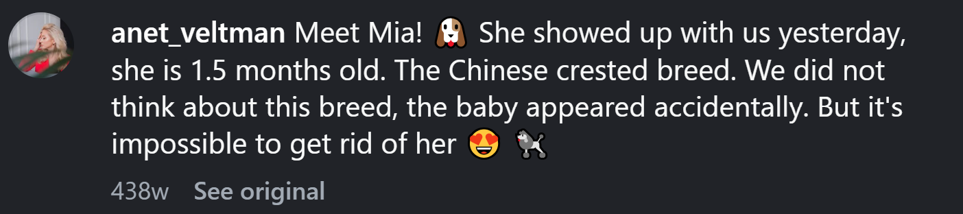 Creature is a popular emote of a dog, particularly a female Chinese Crested named Mia https://i.nuuls.com/DkrR0.png. The original creature used for the popular emote (seen below) is owned by social media influencer Anet Veltman, who has uploaded numerous videos of creature on her Instagram and TikTok pages.