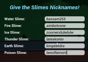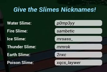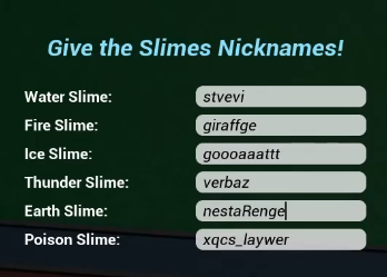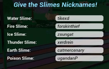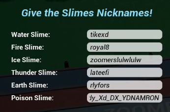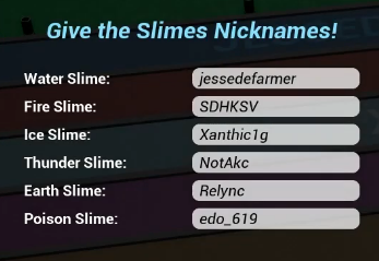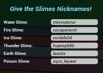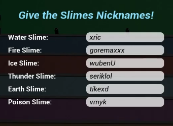 - The game is quite simple. There are 6 slimes: Water Slime, Ice Slime, Fire Slime, Thunder Slime, Earth Slime, and Poison Slime.