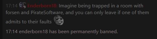 Enderborn18: Imagine being trapped in a room with forsen and PirateSoftware, and you can only leave if one of them admits to their faults Aware